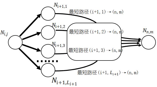 既然在(n-2)段的结点我们可以通过比较大小来解决,那么在(n-2)段结点去终点的最短路径已知的情况下,我们也可以比较大小得知(n-3)段去往终点的最短路径。以此类推,起点到终点的问题也就能解决了。如上图所见,对于第i段的结点Ni,j,因为后面的第(i+1)段的每一个结点去往终点Nn,m的最短路径已经算出来了, 而Ni,j去终点Nn,m的路径也就是这Li+1条,无非是第(i+1)段的每一个结点去往终点Nn,m的最短路径各自在前面多一条边C(i,j)→(i+1,k)(1≤k≤Li+1)罢了。既然如此,从Ni,j到Nn,m的最短路径不就是这Li+1条相互比较大小取最短的那个么?仅此而已。