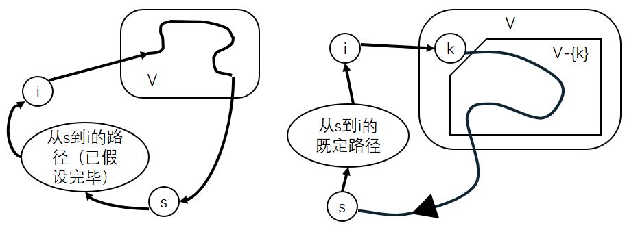 V是空集时,结果为结点i到s的边长度。V中只有一个结点k时,结果为i→k→s。至于起点s到结点i怎么走,完全可以进行大量假设,用“非要经过”的“非要”二字即可。整体上,直接计算d(s,G)。 计算过程就是不同路径选择下的树状的探索。这其中,更小的距离还需要一个或多个数组记下来以简化后续计算工作。